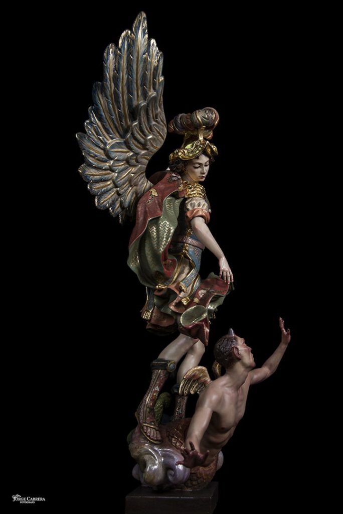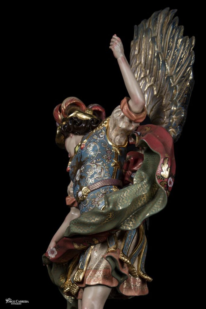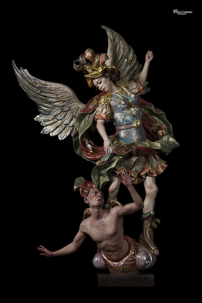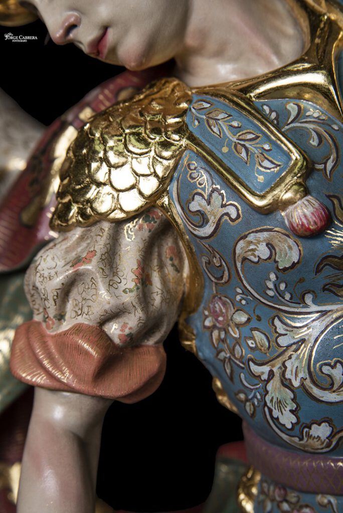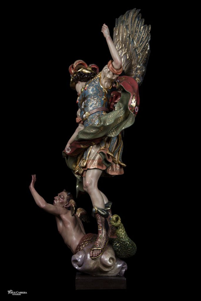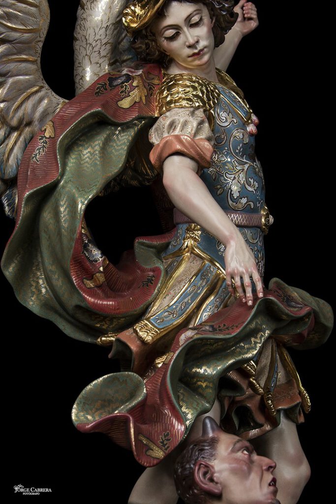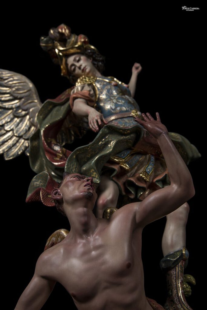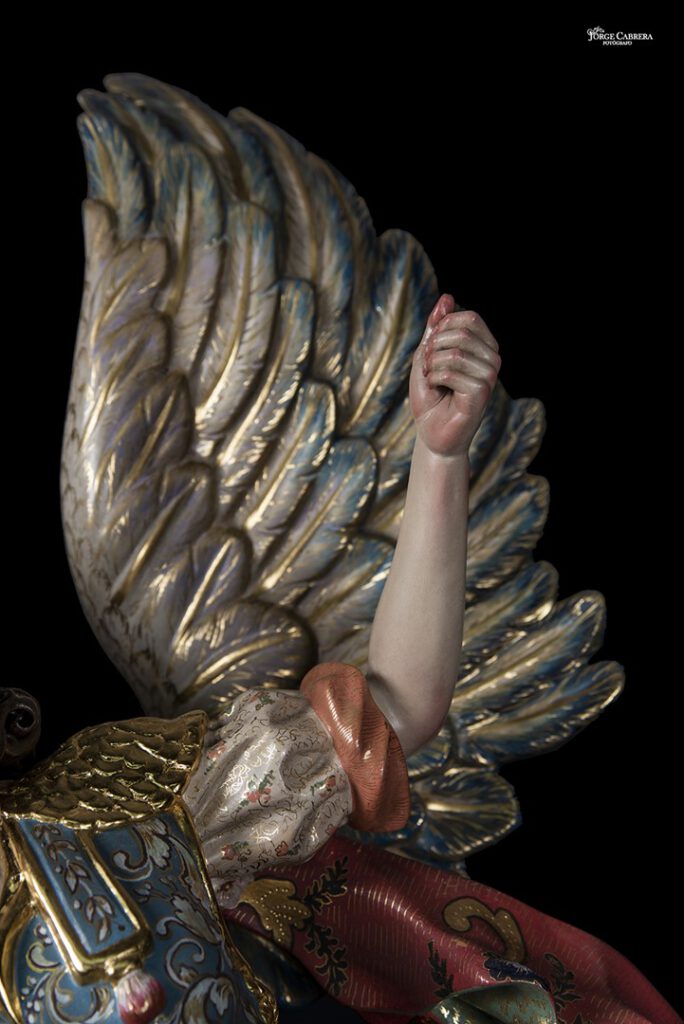 Se mostrarán a falta de los detalles de orfebrería que están siendo cincelado por el orfebre Miguel Cuadros Belizón de San Fernando, en este caso San Miguel llevará, lanza, en la mano izquierda, escudo en el antebrazo derecho, el demonio lleva grilletes y cadena que va a la mano derecha del Arcángel, desde aquí agradezco a Miguel por su cuidadoso trabajo que ya veréis y su entrega a estas nuevas obras, estoy seguro que os gustan mucho su trabajo de cincelado.