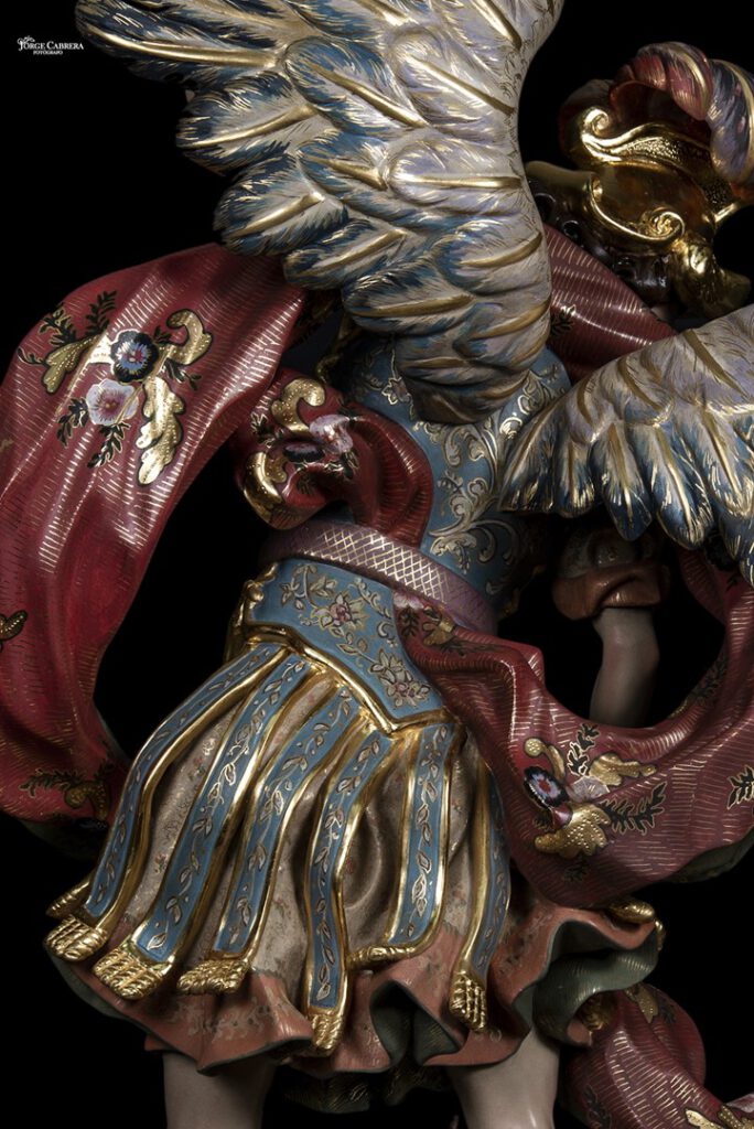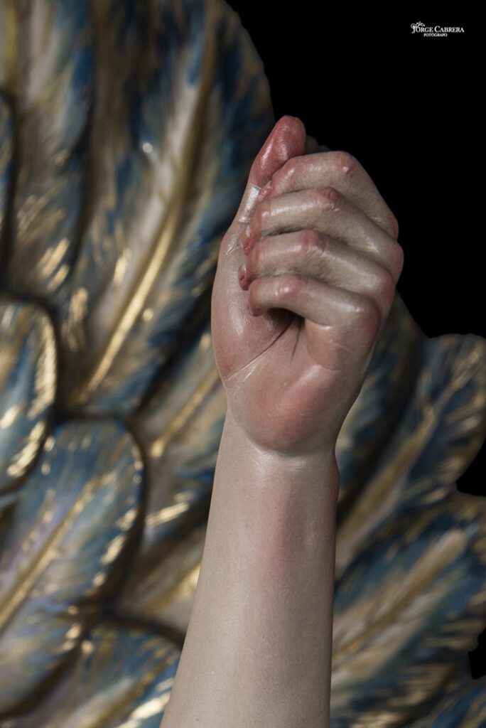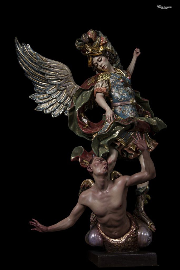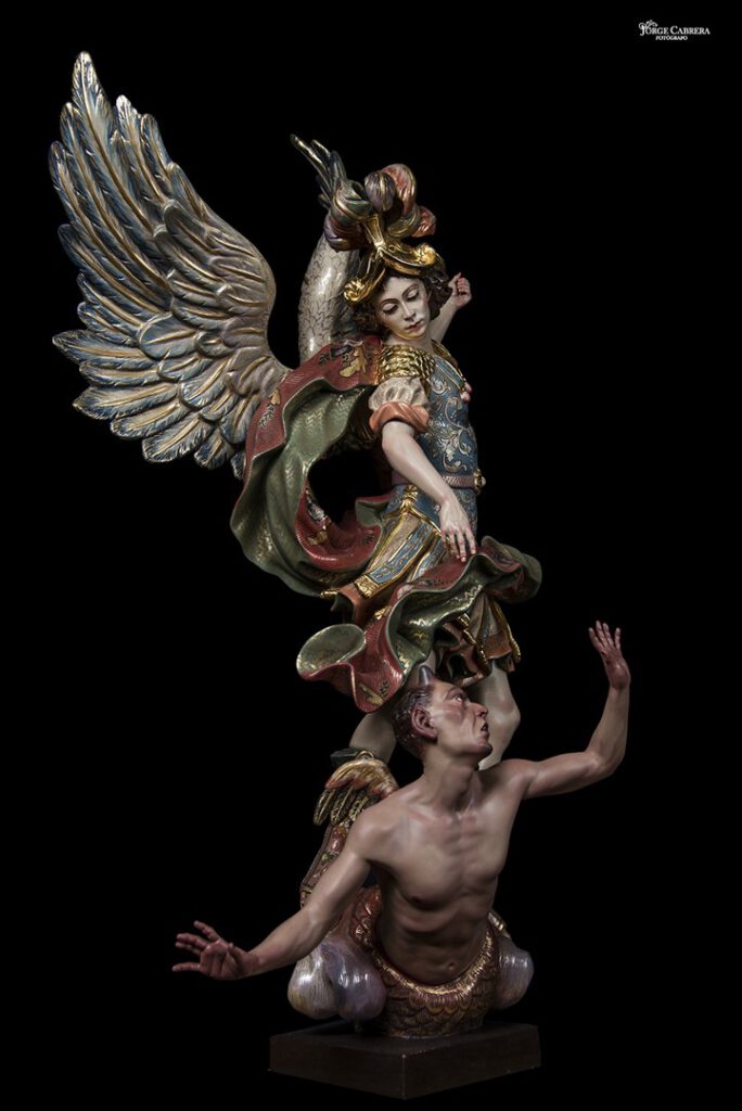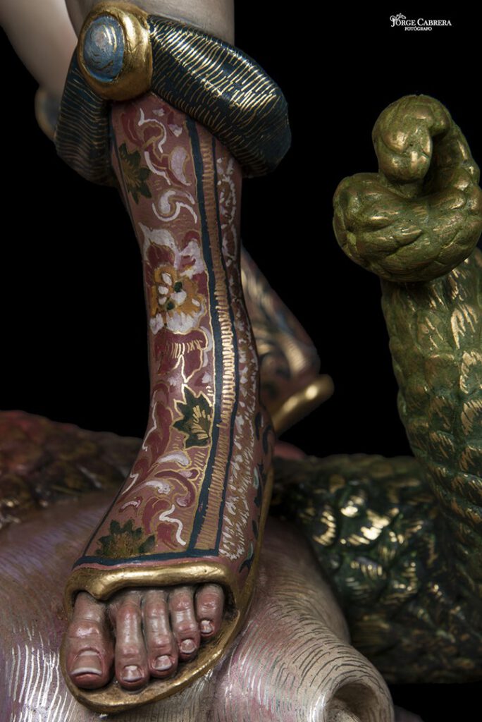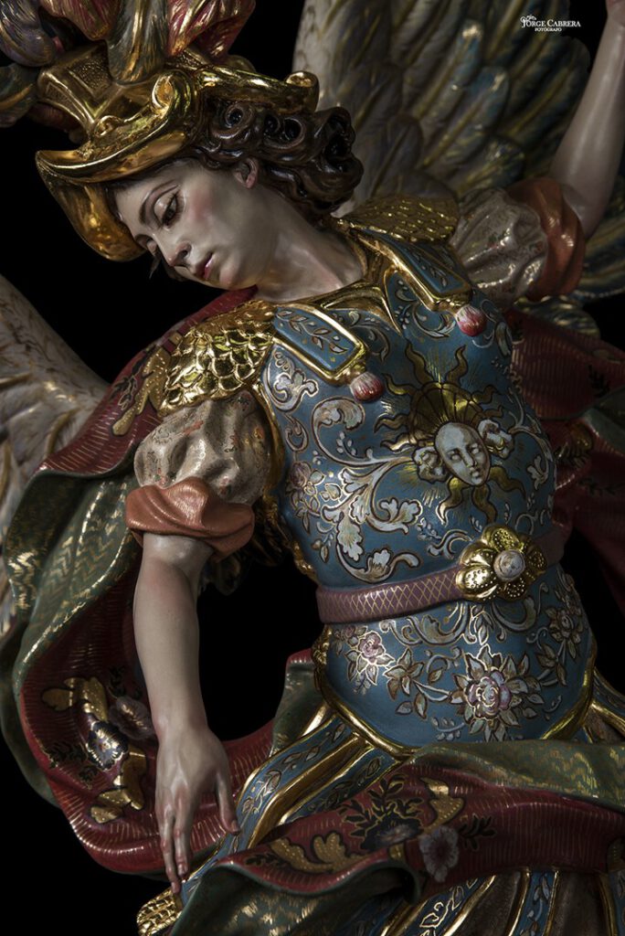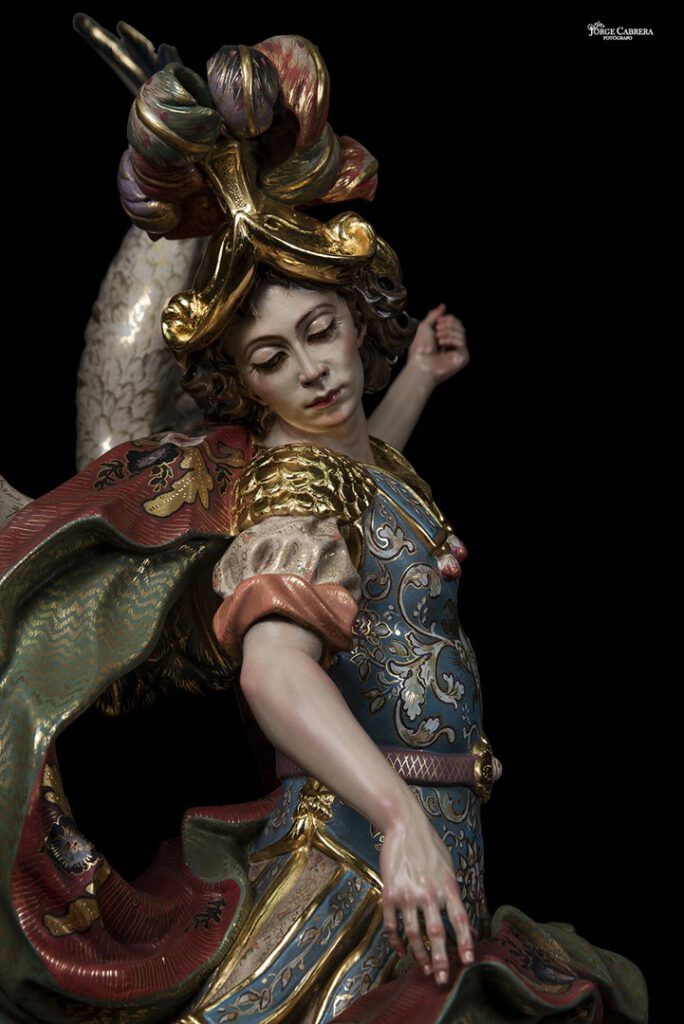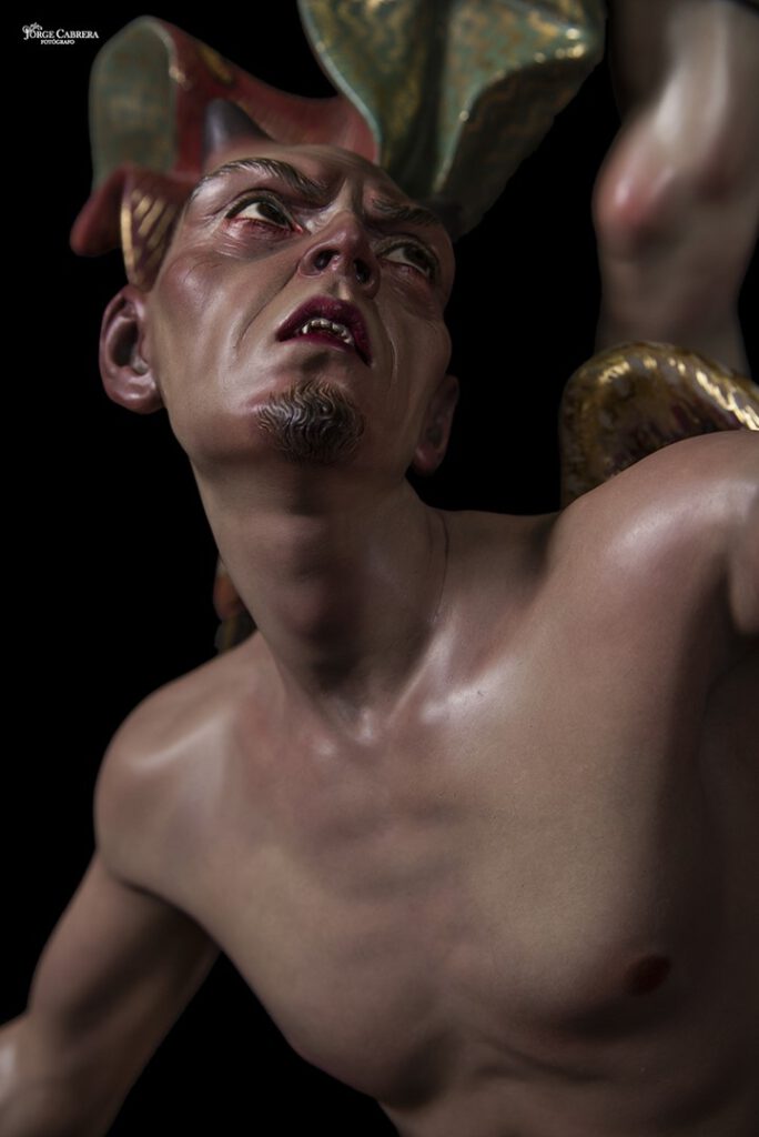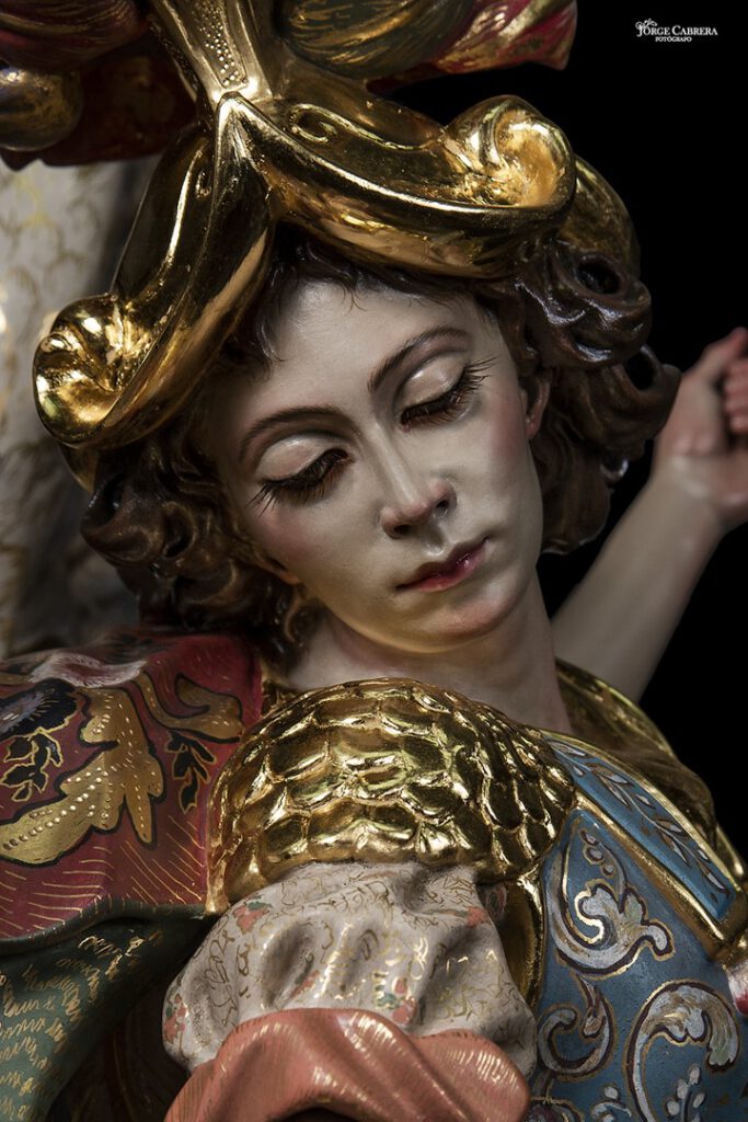 Se mostrarán a falta de los detalles de orfebrería que están siendo cincelado por el orfebre Miguel Cuadros Belizón de San Fernando, en este caso San Miguel llevará, lanza, en la mano izquierda, escudo en el antebrazo derecho, el demonio lleva grilletes y cadena que va a la mano derecha del Arcángel, desde aquí agradezco a Miguel por su cuidadoso trabajo que ya veréis y su entrega a estas nuevas obras, estoy seguro que os gustan mucho su trabajo de cincelado.