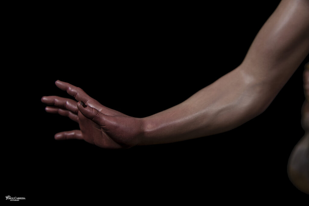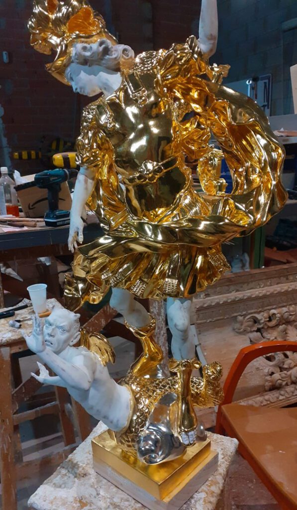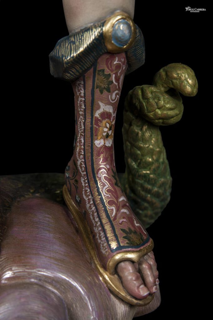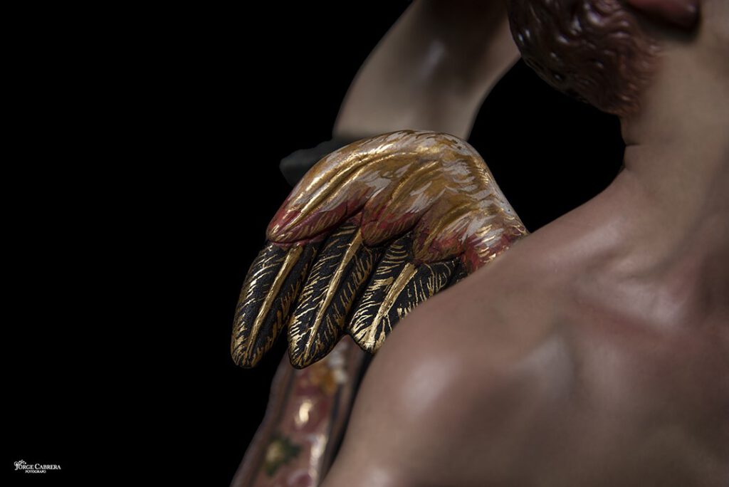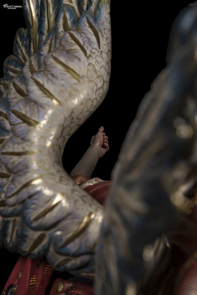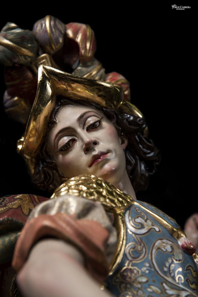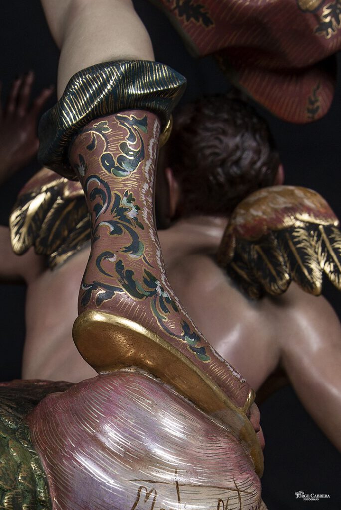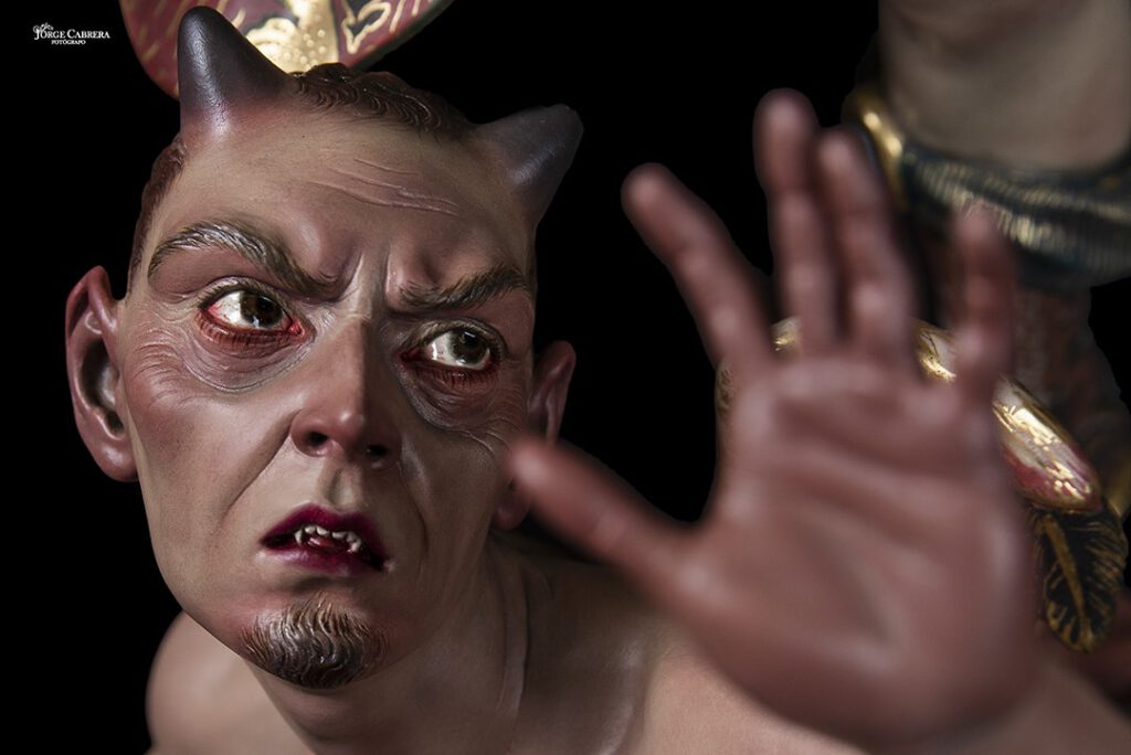 Se mostrarán a falta de los detalles de orfebrería que están siendo cincelado por el orfebre Miguel Cuadros Belizón de San Fernando, en este caso San Miguel llevará, lanza, en la mano izquierda, escudo en el antebrazo derecho, el demonio lleva grilletes y cadena que va a la mano derecha del Arcángel, desde aquí agradezco a Miguel por su cuidadoso trabajo que ya veréis y su entrega a estas nuevas obras, estoy seguro que os gustan mucho su trabajo de cincelado.