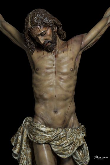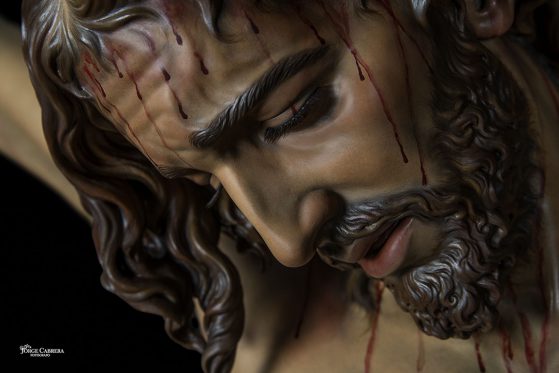 Las policromías sí son realizadas en mi estudio por mi oficial y mi persona, ya que el color de la obra es algo muy personal. Este proceso pictórico ha sido muy laborioso y lento ya que está policromado desde el soporte del estuco con oleo, muchas veladuras desde oscuro al claro, trabajando todos la anatomía y expresión del señor, sutilmente resaltando el maltrato recibido Cristo, desde su prendimiento hasta la crucifixión, pero siempre siendo agradable y sin estropear la dulzura en su expresión y dejando ver el minucioso estudio anatómico.