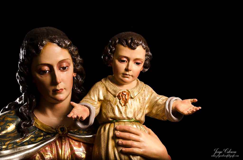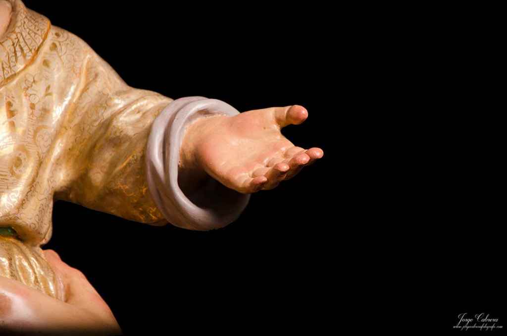 La imagen presentaba multitud de grietas, algunas de seria consideración que afectaban a la unidad de las piezas. Algunas piezas fueron separadas completamente para su posterior adhesión adecuada, como pueden ser varios elementos del ropaje, y el dedo anular de la mano derecha, este último, reforzado con una espiga interior. El resto de separaciones de ensambles, fendas y roturas, fueron tratados mediante una inyección de resina acrílica epoxídica de alta resistencia especializada, cuya viscosidad permite ser levemente absorbida por la madera y garantizar una unión muy resistente. Estas inyecciones fueron repetidas hasta en cuatro ocasiones, hasta que las grietas quedaron plenamente selladas. Posteriormente, se aplicó otra resina epoxídica compatible, de la misma naturaleza química, pero aditivada, y especializada para el sellado lignario, con la cual se recompusieron los volúmenes de cada zona afectada.